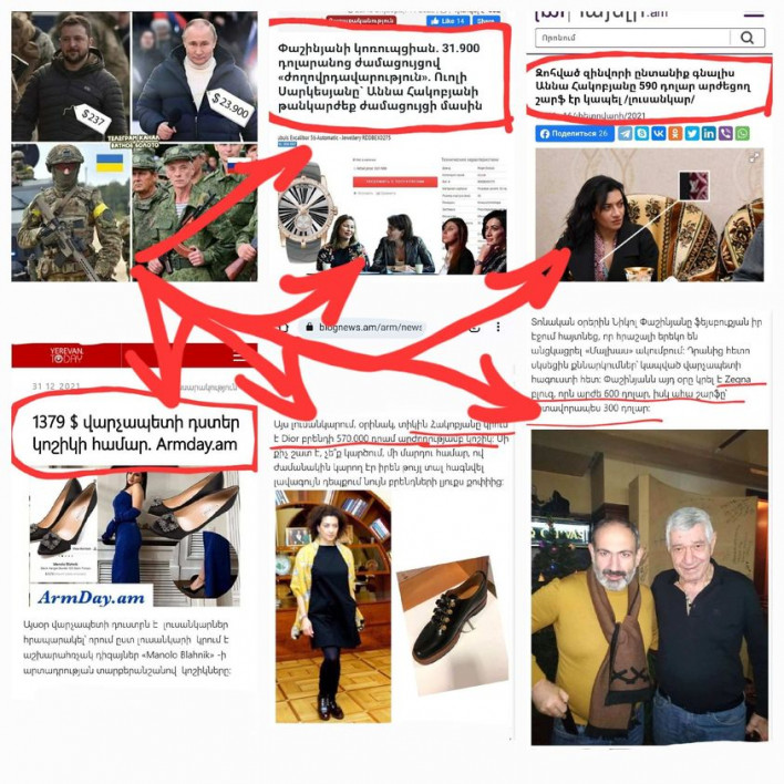 Երկու օր է ֆեյսբուքյան որոշ օգտատերեր, ովքեր այս իշխանությունների երկրպագուներն են, իրենց էջերում տեղադրում են Պուտինի և Զելենսկու լուսանկարները՝ իրենց հագի բաճկոնների գնանշումներով և հիշում, չզարմանաք, մեր "նախկինների" թալանը. և՛ Պուտինին նկատմամբ իրենց ատելությունն են արտահայտում՝ նրան նաև ներկայացնելով որպես թալանչի, և՛ մեր նախկիններին են հիշում...