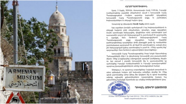 «Այսօր, 3 Ապրիլ, 2024-ին, մօտաւորապէս ժամը 11:00-ին, Իսրայէլի ոստիկանութիւնը ապօրինի տեղահանում սկսած է Երուսաղէմի Հայոց Պատրիարքութեան «Կովերու պարտէզ» կալուածէն՝ ոչնչացնելով Երուսաղէմի Հայոց Պատրիարքարանի գոյքը, եւ յարձակելով հոգեւորականներու եւ տեղացի հայերու վրայ: