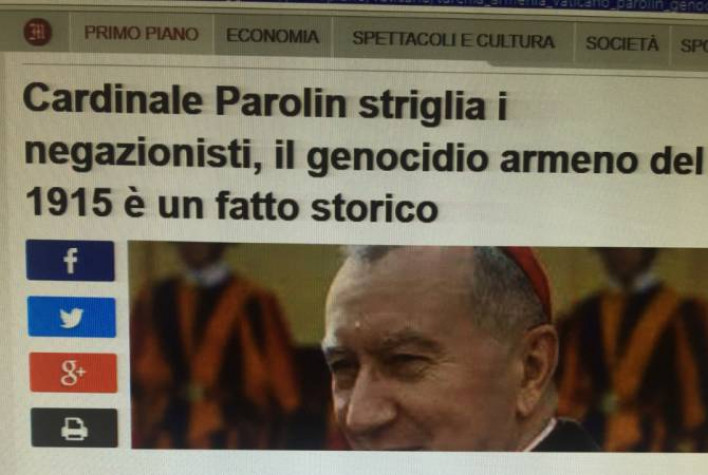 Հուլիսի 12-ին Սուրբ Աթոռի պետական քարտուղար կարդինալ Պիետրո Պարոլինը Իտալիայի Ֆրիուլի-Վենեցիա-Ջուլիա մարզի Աքուիլեա քաղաքում կազմակերպված Առաջին աշխարհամարտի ավարտին նվիրված միջոցառումների շրջանակներում ունեցած ծավալուն ելույթի մեջ անդրադարձել է նաև Հայոց ցեղասպանությանը՝ հետևյալ ձևակերպմամբ. «Այդ համաշխարհային հակամարտությունը հնարավոր է դարձրել այն, ինչ մեզ մինչ օրս սարսափով է լցնում. զանգվածային կոտորածների սկիզբ, որոնց զոհն էր հայկական բնակչությունը (ում օգնության էր հասել այն ժամանակ գրեթե միայն Սուրբ Աթոռը)` այն աստիճանի, որ նոր, մինչ այդ որևէ բառարանում գոյություն չունեցող բառ ստեղծելու բառ ստեղծելու անհրաժեշտություն է առաջացրել՝ «ցեղասպանություն», որն այսօր, ցավոք, ներկայիս բառապաշարի մաս է կազմում»: «Արմենպրես»-ի փոխանցմամբ, հուլիսի 13-ին Իտալիայի հեղինակավոր Իլ մեսաջերո թերթի Վատիկանում հավատարմագրված հայտնի լրագրող Ֆրանկա Ջանսոլդատին մեկնաբանություն է հրապարակել կարդինալ Պարոլինի ելույթի առնչությամբ, հետեւհալ վերտառությամբ՝ «Կարդինալ Պարոլինը կշտամբում է ժխտողներին.1915 Հայոց Ցեղասպանությունը պատմական փաստ է»: Եթե Թուրքիայի կառավարությունը 103 տարի հետո համառորեն հերքում է Հայոց ցեղասպանության պատմական փաստը, Վատիկանի պետական քարտուղար Կարդինալ Պիետրո Պարոլինը, առանց երկբայելու, դատապարտում է ժամանակի օսմանյան կառավարությանը՝ հայկական փոքրամասնության բնաջնջման ծրագրի համար: Աքուիլեա քաղաքում կայացած «Հարյուր տարի առաջին աշխարհամարտի ավարտից հետո» թեմայով ելույթի ժամանակ, Կարդինալը՝ ընդգծելով, թե ինչպես է քաոսը կարողացել քայքայել «Եվրոպայում տիրող միջազգային կարգը՝ առանց հաջողելու փոխարինել այն արդար և տևական ձևով» անդրադարձավ այդ ժամանակաշրջանի ամենասև էջին: