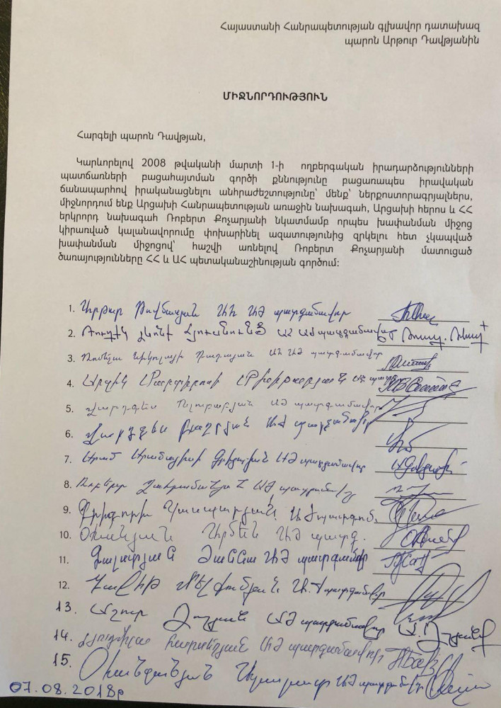 Արցախի Ազգային ժողովի մի խումբ պատգամավորներ օգոստոսի 7-ին միջնորդություն-խնդրագիր են ներկայացրել ՀՀ գլխավոր դատախազին՝ ՀՀ երկրորդ նախագահ Ռոբերտ Քոչարյանի նկատմամբ խափանման միջոց կիրառած կալանավորումը փոխելու համար։ Այս մասին Ֆեյսբուքի իր էջում գրել է Արցախի Հանրապետության Ազգային ժողովի նախագահի մամուլի քարտուղար Անուշ Ղավալյանը: «Արցախի Հանրապետության Ազգային ժողովի մի խումբ պատգամավորներ օգոստոսի 7-ին միջնորդություն-խնդրանք են ներկայացրել Հայաստանի Հանրապետության գլխավոր դատախազին՝ Արցախի առաջին և ՀՀ երկրորդ նախագահ Ռոբերտ Քոչարյանի նկատմամբ որպես խափանման միջոց կիրառված կալանավորումը փոխարինելու ազատությունից զրկելու հետ չկապված խափանման միջոցով՝ հաշվի առնելով Ռոբերտ Քոչարյանի մատուցած ծառայությունները ԱՀ և ՀՀ պետականաշինության գործում»,- գրել է Ղավալյանը: Արցախի խորհրդարանը բաղկացած է 33 անդամից։ Խնդրագրի տակ ստորագրել են 15 հոգի․ Ղուլյան Աշոտ - ԱԺ նախագահ Արթուր Թովմասյան - «Հայրենիք» Հյուսնունց Ռուդիկ - «Հայրենիք» Դադայան Ռամելա - «Հայրենիք» Մխիթարյան Արզիկ - «Հայրենիք» Ուլուբաբյան Վարդգես - «Հայրենիք» Բաղրյան Վարդգես - «Ժողովրդավարություն» Գրիգորյան Արամ – «Հայրենիք» Ղահրամանյան Ռոբերտ - «Հայրենիք» Կասպարյան Գրիգորի - «Հայրենիք» Օհանյան Արմեն - «Հայրենիք» Գալստյան Ժաննա - «Ժողովրդավարություն» Մելքումյան Դավիթ - «Ժողովրդավարություն» Բարսեղյան Լյուդմիլա - «Ժողովրդավարություն» Օհանջանյան Արարատ - «Հայրենիք» Հայաստանի երկրորդ նախագահ Ռոբերտ Քոչարյանը կալանավորվել է հուլիսի 27-ին։ Նա մեղադրվում է 2008-ի հետընտրական իրադարձություններից հետո սահմանադրական կարգը տապալելու հոդվածով։