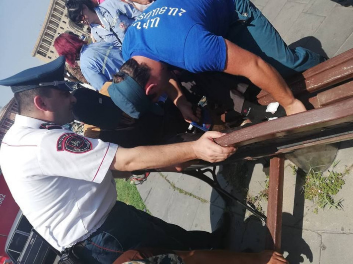 Հանրապետության հրապարակում քաղաքացին ոտքերը մեխել է նստարանին. լուսանկարներ