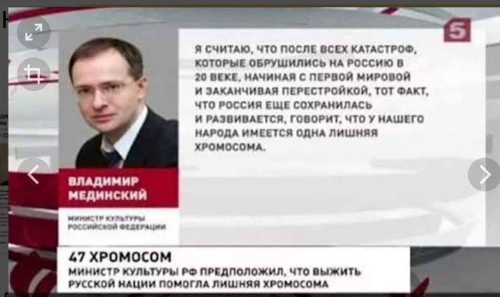 Կինոռեժիսոր Տիգրան Խզմալյանը ֆեյսբուքյան իր էջում գրել է. «Հրամեցեք ու վայելեք՝ Ռուսաստանի մշակույթի նախարար Մեդինսկին պաշտոնապես հայտարարել է, որ ռուս ազգի գենը մեկ ավելորդ քրոմոսոմ ունի, այլապես ռուսները չէին դիմանա պատմական փորձություններին։ Նախարարը տեղյակ չէ, որ ավելորդ քրոմոսոմը՝ Դաունի հիվանդության ախտանիշ է, մտավոր ու ֆիզիկական թերզագացման դիագնոզ։ «Հայուգենը» ոչինչ է «ռուսագենի» դեմ»։
