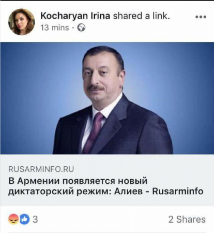 Հայաստանի երկրորդ նախագահ Ռոբերտ Քոչարյանի եղբոր դուստրը՝ Իրինա Քոչարյանը Facebook-ի իր էջում կիսվել է Ադրբեջանի նախագահ Ալիևի խոսքերով, որոնք վերջինս ասել է ԵԱՀԿ գլխավոր քարտուղարի հետ հանդիպման ընթացքում: