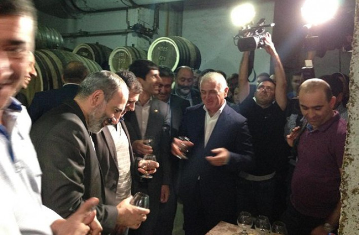 ՀՀ վարչապետ Նիկոլ Փաշինյանին,«Արարատի» գինու գործարանում շրջայցի ընթացքում առաջարկեցին համտեսել իրար կողք շարված 9 հսկա ցիստեռների պարունակությունից՝ կոնյակից։ «Էս բոլորից պիտի խմե՞նք»,- կատակեց վարչապետը։