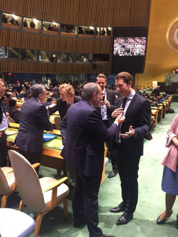 Վարչապետ Նիկոլ Փաշինյանի մամուլի քարտուղար Արման Եղոյանն Facebook-ի իր էջում նոր լուսանկարներ է հրապարակել ՄԱԿ ԳԱ 73-րդ նստաշրջանի ընդհանուր քննարկման բացումից: Լուսանկարում պատկերված են վարչապետ Նիկոլ Փաշինյանը և Ավստրիայի կանցլեր Սեբաստիան Կուրցը: