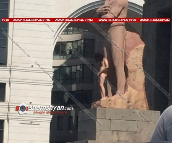 Տարօրինակ դեպք Երևանի կենտրոնում. տղամարդը մերկ վիճակում բարձրացել է Ստեփան Շահումյանի արձանի վրա. նկարներ