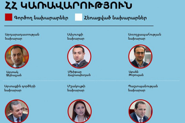 ՀՀ կառավարությունն ունի 17 նախարարություն, հետևաբար` 17 նախարար։ Վեցին աշխատանքից հեռացնելուց հետո այս պահին մնացել են 11-ը։