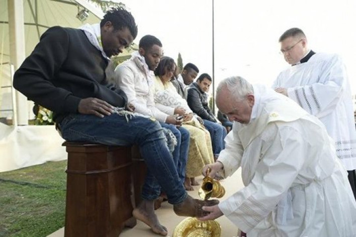 Հռոմի պապ Ֆրանցիսկոսը Չարչարանաց շաբաթվա Ավագ հինգշաբթի օրը լվացել և համբուրել է 12 հավատացյալների ոտքերը։ Նրանցից 11-ը եղել են փախստականներ, 1-ը՝ իտալուհի՝ քաղաքական ապաստանի ստացման համար հայց ներկայացրած անձանց ժամանակավոր պահման կենտրոնից։ Այս մասին հայտնում է RIA Novosti-ն։ 12 հավատացյալներից 5-ը եղել են կաթոլիկներ, 3-ը՝ մուսուլման, 3-ը՝ ղպտի և 1-ը՝ հինդու։ Փախստականների ժամանակավոր պահման կենտրոնում, որտեղ գտնվում են 892 ներգաղթյալներ, Ֆրանցիսկոս պապը պատարագ է մատուցել, ինչպես նաև հանդիպել փախստականների երեք ընտանիքների հետ, որոնցից 2-ը եղել են Էրիթրեայից, մեկը՝ Պաղեստինից։ Հռոմի պապը դատապարտել է Բրյուսելում իրականացված ահաբեկչական գործողությունները և հայտարարել, որ ահաբեկչությունների համար մասամբ մեղավոր են զենք արտադրողները։