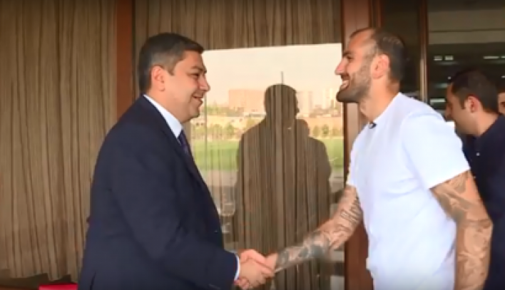 Տևական դադարից հետո Հայաստանի հավաքական վերադարձած հարձակվող Յուրա Մովսիսյանը այսօր Երևանում հանդիպել է ՀՖՖ նախագահ Արթուր Վանեցյանի հետ: ՀՖՖ-ն տեսանյութ է պատրաստել, որտեղ հայ ֆուտբոլիստը նա մի շարք ուշագրավ մանրամասներ է հայտնում, կոչով դիմում երկրպագուներին և հանդիպում Արթուր Վանեցյանի հետ: Մանրամասները՝ տեսանյութում: Հիշեցնենք, որ Ազգերի լիգայի մրցաշարի շրջանակներում Հայաստանի հավաքականը հանդիպելու է Ջիբրալթարի (հոկտեմբերի 13-ին) ու Մակեդոնիայի (հոկտեմբերի 16-ին) հավաքականների հետ: