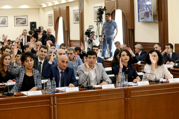 Երևանի ավագանին քվեարկությամբ հաստատել է մշտական հանձնաժողովների կազմը: Կանոնակարգի համաձայն՝ ավագանու մշտական չորս հանձնաժողովներից, քվեարկության համաձայն, Ֆինանսավարկային և տնտեսական հարցերի մշտական հանձնաժողովի նախագահ է ընտրվել «Իմ քայլը» խմբակցությունից Աշոտ Մնացականյանը, տեղակալ՝ Լևոն Հովհաննիսյանը, Մշակույթի, կրթության և սոցիալական հարցերի մշտական հանձնաժողովի նախագահ է ընտրվել «Իմ քայլը» խմբակցությունից Սաթենիկ Մկրտչյանը, տեղակալ՝ Հակոբ Մելիքյանը, Քաղաքաշինության և հողօգտագործման հարցերի մշտական հանձնաժողովի նախագահ է ընտրվել «Իմ քայլը» խմբակցությունից Արսեն Կարապետյանը, տեղակալ՝ «Բարգավաճ Հայաստան» խմբակցությունից Մարկոս Հարությունյանը, ավագանու Իրավական հարցերի մշտական հանձնաժողովի նախագահ է ընտրվել «Իմ քայլը» խմբակցությունից Արուսյակ Ջուլհակյանը, տեղակալ՝ Գայանե Մելքոմ Մելքոմյանը: Երևանի ավագանին որոշել է ավագանու հերթական նիստը հրավիրել նոյեմբերի 13-ին: Հիշեցնենք, որ ԿԸՀ որոշման համաձայն՝ «Իմ քայլը» կուսակցությունների դաշինքը ընտրությունների արդյունքում ստացել է 57 մանդատ, «Բարգավաճ Հայաստան» կուսակցությունը՝ 5 և «Լույս» դաշինքը՝ 3 մանդատ: Նիստի ավարտից հետո Երևանի քաղաքապետ Հայկ Մարությանը պատասխանել է լրագրողների հարցերին: Այս մասին հայտնում են Երևանի քաղաքապետարանի տեղեկատվության և հասարակայնության հետ կապերի վարչությունից: