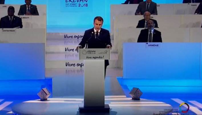 Ֆրանկոֆոնիայի 17-րդ գագաթնաժողովի իր ելույթում Ֆրանսիայի նախագահ Մակրոնը հայտարարեց. «Դուք գիտեք՝ ինչ բարձր տեղ է գրավում ձեր երկիրը ֆրանսիացիների համար: Հայաստան բառը հուզիչ զգացմունք է արթնացնում ֆրանսիացիների հոգում:Ցավակցում եմ աշխարհահռչակ շանսոնյե Շառլ Ազնավուրի մահվան կապակցությամբ:Նա երգում էր ու պահպանում հայկականությունը, կազմակերպում էր օգնության գործընթացներ, խրախուսում քաջությունը: Շառլ Ազնավուրը խորհրդանշում է մի կյանք, որն արտահայտում է այն ամենը, ինչը մեզ միացնում է, բայց գաղթականի որդին չուներ ոչինչ, հայերեննն իր առաջին լեզուն էր, երկրորդը՝ վրացերենը»: «Ֆրանկոֆոն երկրների ընտանիքը միասնական է ու համախմբված: Այս լեզուն կարողացել է ընդունել բոլորի մտքերը: Մեր տեսլականն արտահայտվելով լեզվաբանական ընկերությամբ՝ ամեն օր վերաիմաստավորվում ու թարմացվում է: Բոլոր հույսերը, եղբայրության, խաղաղության, արդարության ցանկությունները կազմում են մեր կազմակերպության հիմնաքարերը: Այս գագաթնաժողովը հավաքվում է շատ հատուկ պահի, տեսնում ենք հսկայական փոփոխություններ աշխարհով մեկ: Աշխարհում իրավիճակը խաթարված է ստերով, ատելության քարոզներով: Այն բոլոր կանոնները, որ կարողացել ենք համախմբվել վերջին տարիներին, այլևս չեն գործում: Արժանապատվության, իրավահավասարության հարցերը հարձակման են ենթարկվում: Ի՞նչ կարող է անել Ֆրանկոֆոնիան. աշխատել այնպես, որ բոլորիս հրավիրի սթափության, Ֆրանկոֆոնիան պետք է ուղղված լինի երիտասարդությանը: Մեր առաջին պայքարը պետք է լինի նրանց աշխատանք ու կրթություն մատուցելը... »,- ասել է Ֆրանսիայի նախագահը: