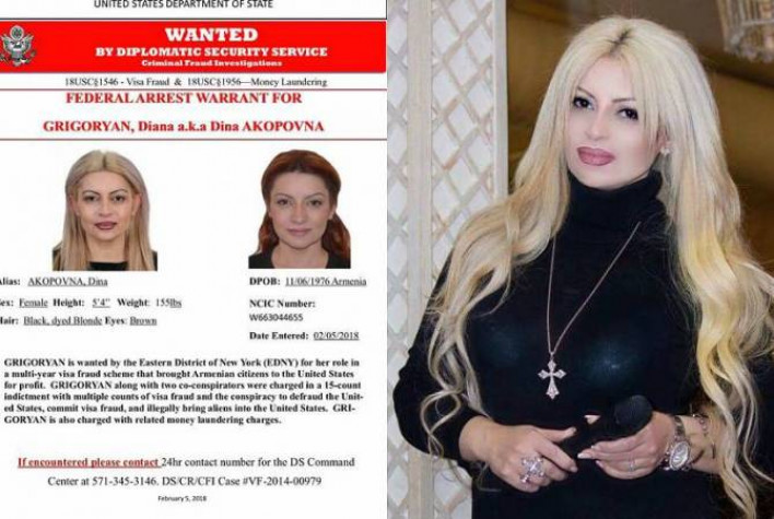 «ԱՄՆ իրավասու մարմինների կողմից հետախուզվող ՀՀ քաղաքացի Դիանա Հակոբի Գրիգորյանը ՀՀ ոստիկանության աշխատակիցների կողմից ձերբակալվել և ՀՀ ոստիկանության Երևան քաղաքի ձերբակալվածների պահման վայր էր տեղափոխվել: Դ. Գրիգորյանի ձերբակալման վերաբերյալ նույն օրը ՀՀ գլխավոր դատախազությունը հայտնել է ԱՄՆ իրավասու մարմիններին: Հիմք ընդունելով ԱՄՆ իրավասու մարմիններից ստացված պատասխանը՝ Դ. Գրիգորյանին կալանավորելու մասին միջնորդություն դատարան չի ներկայացվել, և նա ազատվել է արգելանքից»,- նշեցին ՀՀ դատախազության հանրային կապերի բաժնից: Ոստիկանության Կենտրոնական բաժնի ծառայողների բացատրական աշխատանքների շնորհիվ նոյեմբերի 3-ին ժամը 15.00-ին կամավոր բաժին էր ներկայացել 1976 թվականին ծնված Դիանա Գրիգորյանը: Նա փետրվարի 2-ից Ինտերպոլի ԱԿԲ-ի կողմից հետախուզվում էր ԱՄՆ քրեական օրենսգրքի 18-րդ գլխի 371, 3551, 1546, 1956 հոդվածների մեղադրանքով «ԱՄՆ կառավարության նկատմամբ խարդախության փորձ կատարելը, արտոնագրերի հետ կապված խարդախություն, փողերի լվացում»՝ Ինտերպոլի «Կարմիր անկյունով» քարտի տեսքով:
