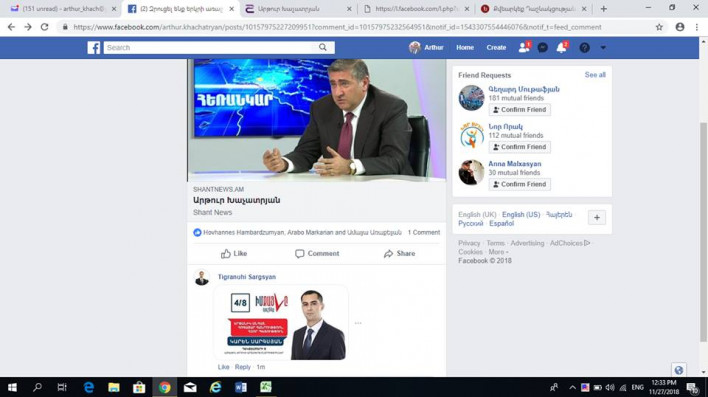 Պատգամավորի դաշնակցական թեկնածու, նախկին գյուղնախարար Արթուր Խաչատրյանն իր ֆեյսբուքյան էջում «սքրին-շոթ» է տեղադրել հետևյալ գրառումով․ «Իմ Քայլի» թեկնածուն իմ էջի վրա, իմ հարցազրույցի տակ, իր գովազդն է դրել: Երևի մարդը գիտակցել է, որ իմ դիտումների քանակը մեծ է, որոշել է առիթից օգտվել»։