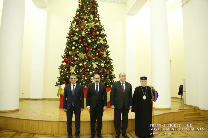 Վարչապետի պաշտոնակատար Նիկոլ Փաշինյանը ՀՀ նախագահ Արմեն Սարգսյանի, Ն.Ս.Օ.Տ.Տ. Գարեգին Բ Ամենայն Հայոց Կաթողիկոսի, ՀՀ Ազգային ժողովի նախագահ Արա Բաբլոյանի հետ մասնակցել է Ամանորի և Սուրբ Ծննդյան տոների կապակցությամբ պետական կառավարման համակարգի ներկայացուցիչների համար կազմակերպված ընդունելությանը:
