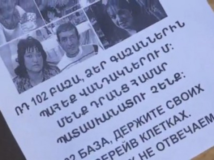 ՌԴ 102 բազա՛, ձեր գազաններին պահեք վանդակներում. Մենք դրանց համար պատասխանատու չենք: Այսօր՝ հունվարի 12-ին, նման կոչ պարունակող փոքրիկ թռուցիկներով բողոքի ակցիա է տեղի ունեցել Գյումրիում, որի նպատակն էր հիշեցնել 4 տարի առաջ բազայի զինծառայողներից մեկի կողմից Գյումրիում Ավետիսյանների ընտանիքի անդամների սպանության, ինչպես նաեւ 2018 թվականի դեկտեմբերին նույն բազայի զինծառայողի կողմից Գյումրիում իրականացված մեկ այլ սպանության մասին։