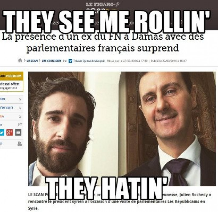 Ինչպես նշում է Al Arabiya-ն, Ռոշեդին, ով ներկայացնում է Ֆրանսիայի «Ազգային ճակատ» կուսակցությունն ու ներառված է եղել Սիրիա մեկնած ֆրանսիական պատվիրակության կազմում, Դամասկոսում հանդիպել է նախագահին ու խնդրել նրա հետ ինքնանկար անել: Այնուհետև Ասադի մասնակցությամբ «սելֆին» տեղադրվել է Twitter-ում: