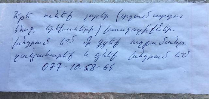 Հայտարարությունը սյան վրա էր փակցված։ Ես խոսեցի, կնոջ անունը Էլեն է, 3 երեխա ունի, ամուսինը մահացել է։ Նաև իր հետ են ապրում ծնողները։