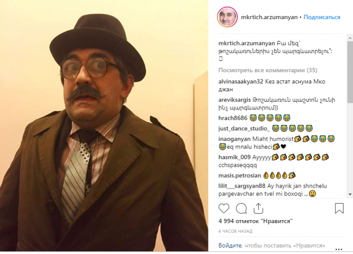 Դերասան, հումորիստ Մկրտիչ Արզումանյանը Instagram-ի իր էջում հումորային լուսանկար է հրապարակել, որին կից հետևյալ գրառումն է. «Բա մեզ` թոշակառուներիս չեն պարգևատրելո՞ւ»: