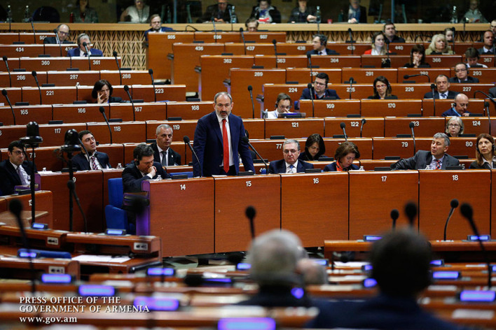 Փաշինյանը վերահաստատեց կրկին՝ ԼՂ-ի հարցի կարգավորման որևէ տարբերակ պետք է ընդունելի լինի Հայաստանի, Լեռնային Ղարաբաղի և Ադրբեջանի ժողովրդի համար: «Ցավոք՝ մենք համանման խոսքեր առայժմ չենք լսում Ադրբեջանից, և ես հույս ունեմ, որ խաղաղության այս ամբիոնից հղված ուղերձն ադրբեջանական հանրության շրջանում կստանա համարժեք արձագանք: Սիրելի ներկաներ՝ պատահական չէ, որ ԵԽ խորհրդարանական վեհաժողովի այս ամբիոնը ես անվանեցի խաղաղության ամբիոն: Հավատում եմ, որ սա այն տեղն է, որտեղ հայհոյանքը պետք է փոխարինի երկխոսությանը, սադրանքը պետք է փոխարինի կառուցողական աշխատանքին: Բայց, ցավոք, Եվրոպայի խորհրդի խորհրդարանական վեհաժողովի ամբիոնը երբեմն օգտագործվում է նաև պատերազմներ հրահրելու համար», - ասաց Փաշինյանը՝ շարունակելով. - «Այս առումով չեմ կարող չնկատել, որ ԼՂ-ի հարցի հետ առնչվող այն քննարկումները, որ ԵԽԽՎ-ում տեղի ունեցան 2016թ. հունվարին, նույն թվականի ապրիլին բռնկված Չորսօրյա պատերազմի նախերգանքը դարձան և բարենպաստ հող ստեղծեցին Ադրբեջանի զինված ուժերի կողմից հարձակողական գործողություններ սկսելու համար: Չեմ ուզում վստահորեն պնդել, որ գիտակցաբար, բայց այնուամենայնիվ այդ քննարկումների և փաստաթղթերի հեղինակները պատերազմի հրձիգ դարձան, որը մի քանի հարյուր կյանքեր արժեցավ թե՛ Հայաստանի, թե՛ ԼՂ-ի, թե՛ Ադրբեջանի համար: Այսօր էլ, ցավոք, ինչպես միջազգային այլ հարթակներում, այնպես էլ ԵԽԽՎ-ում մենք տեսնում ենք այդ կառույցներն աշխարհաքաղաքական խաղերի, կոնֆլիկտների մեջ ներքաշելու, հակամարտության կողմ դարձնելու փորձեր, ինչը բացարձակապես հակառակ է այդ կազմակերպությունների էությանն ու առաքելությանը...»: