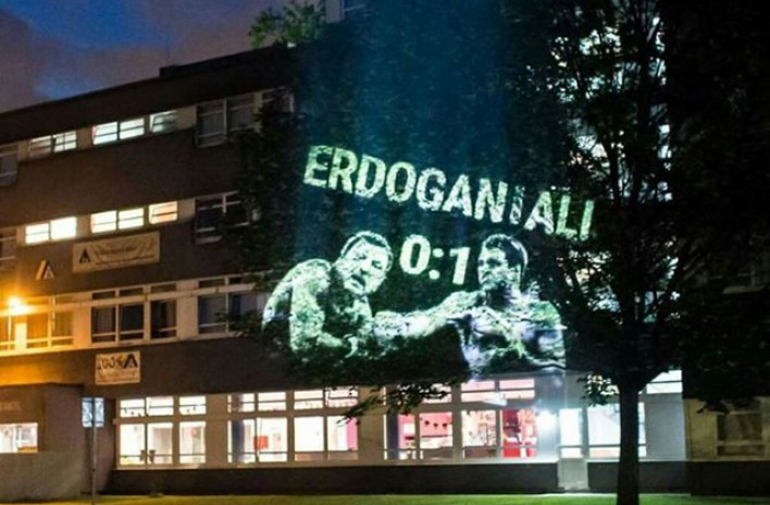 Գերմանացի արվեստագետները Թուրքիայի նախագահ Ռեջեփ Թայիփ Էրդողանի` Մուհամեդ Ալիի հոգեհանգստի արարողության ժամանակ ապրած ամոթալի պահերի վրա ուշադրություն գրավելու համար Բեռլինում երեկոյան ժամերին շենքերի պատերին բռնցքամարտիկի նրանց պատկերներով «Էրդողան-Ալի 0-1» գրությամբ պրոյեկցիոն ծաղրանկարի ցուցադրություն են կազմակերպել: Այս մասին, ինչպես հաղորդում է «Արմենպրես»-ը, հայտնում է թուրքական odatv.com լրատվական կայքը` նշելով, որ դա Էրդողանի անհավասարակշիռ դրսեւորումնների դեմ գերմանացի արվետագետների ինքնատիպ բողոքն է: Գերմանացի արվեստաբան Պիկսել Հելփերը՝ նշելով, որ սոցիալական մամուլում Էրդողանը մարդու իրավունքները ոտնահարող քաղաքականություն է տանում, «Էրդողան-Ալի 0-1» ծաղրանկարը մեկնաբանել է հետեւյալ կերպ. «Ժողովրդավարական ընտրությունների ճանապարհը բացելու համար Էրդողան բեյին կոչ ենք անում անպայման հրաժարական տալ»: Գերմանացի արվեստագետները հաճախ են նմանօրինակ «գովազդներ» կազմակերպում Բեռլինում Թուրքիայի դեսպանատան շենքի պատին` նվիրված Էրդողանի քաղաքականությանը, սակայն, այս անգամ նրանք այդ ծաղրանկարը տեղադրել են քաղաքի տարբեր հատվածներում եւս: Միջազգային մամուլը հայտնել է, որ լեգենդար բռնցքամարտիկ Մուհամեդ Ալիի հուղարկավորությանը մասնակցելու համար ԱՄՆ ժամանած Էրդողանը խիստ անհարգալջց ընդունելության է արժանացել: Ըստ ԶԼՄ-ների Ալիի հոգեհանգստի արարողությունից Էրդողանի շտապ Թուրքիա վերադառնալու պատճառ են հանդիսացել մի քանի միջադեպե. հոգեհանգստի արարողության ժամանակ Էրդողանը ցանկացել է Քաբա (իսլամական սրբավայր) կատարած ուխտագնացությունից բերած իր քիսուայի (իսլամական ծածկոց) մի մասը դնել դագաղի վրա, սակայն ստացել է «Մենք դա հետո կդնենք» պատասխանը, ինչը նա դժգոհությամբ է ընդունել: Բացի այդ, մերժվել է «Ղուրան» կարդալու իր եւ Կրոնական գործերի նախարար Մեհմեթ Գյորմեզի ցանկությունը: WLKY.com կայքն էլ գրել է, որ Ալլի հոգեհանգստից Էրդողանի շտապ հեռանալու համար գլխավոր պատճառը հանդիսացել է այն, որ Մոհամեդ Ալիի հոգեհանգստի հանդիսավոր արարողության մասնակից ԱՄՆ-ի ամենաճանաչված հրեա ռաբբի առաջնորդ, քաղաքական ակտվիստ Մայքլ Լերները, Ալիի հիշատակին ունեցած ելույթում, դիմելով աշխարհի առաջատար երկրների առաջնորդներին, հայտարարել է. «Թուրքիայի առաջնորդներին ասեք վերջ տան քրդերի սպանություններին»: Թուրքական ԶԼՄ-ներն ավելի վաղ հայտնել էին, որ Մուհամեդ Ալիի երկրպագու Էրդողանը նրա հուղարկավորությանը մասնակցելու համար ԱՄՆ այցը ծրագրել էր 2 օր ժամկետով, սակայն նրա գլխավորած պատվիրակությունը ընդամենը 4-5 ժամ հետո շտապ հետ վերադառնալու որոշում է ընդունել: CNN Turk-ն այդ առնչության հաղորդել է, որ Էրդողանի հետ վերադառնալու պատճառը հանդիսացել է այն, որ ԱՄՆ-ում նրան հարգալից չեն դիմավորել: Մուհամեդ Ալիի ընտանիքը Էրդողանի «ժեստային» պահանջներին պատասխանել է. ««Մենք դա չենք ցանկանում», ինչը վիրավորել է Էրդողանի պատվիրակությանը: Բացի այդ, ըստ թուրքական ԶԼՄ-ների` հոգեհանգստի արարողության ժամանակ Էրդողանին հրել են հետին շարքեր, իսկ Մոհամեդ Ալիի ընտանիքից ոչ մեկը չի մոտեցել բերած նվերները ստանալու համար եւ Էրդողանը ստիպված 15 րոպե սպասել է դրա համար: