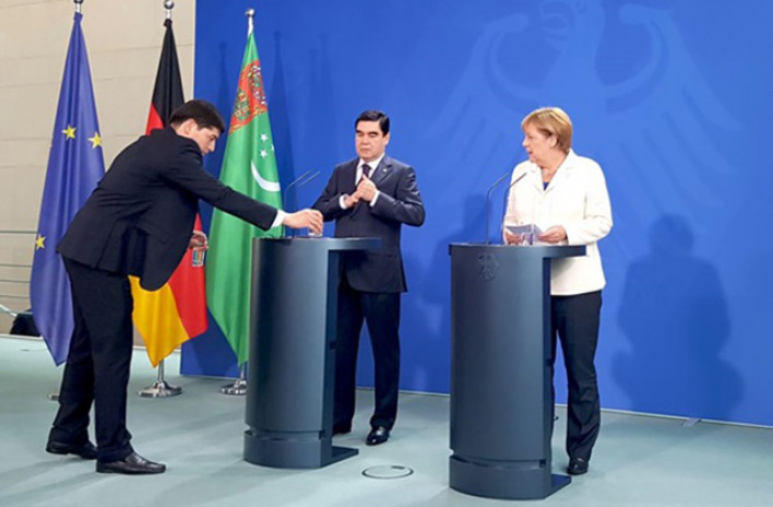 Բեռլինում Գերմանիայի կանցլեր Անգելա Մերկելի հետ Թուրքմենստանի նախագահ Գուրբանգուլի Բերդիմուհամմեդովի հետ հանդիպմանը վերջինիս ջուրը վերջին պահին փոխում են, հայտնում է NEWSru.com-ը: