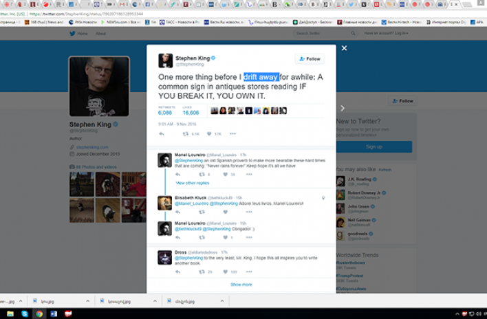 ԱՄՆ նախագահական ընտրություններում հանրապետական թեկնածու Դոնալդ Թրամփի հաղթանակից հետո ամերիկացի հայտնի գրող Սթիվեն Քինգը, որը քարոզարշավի ժամանակ աջակցում էր դեմոկրատ Հիլարի Քլինթոնին, հայտարարել է, որ հեռանում է Twitter-ից։