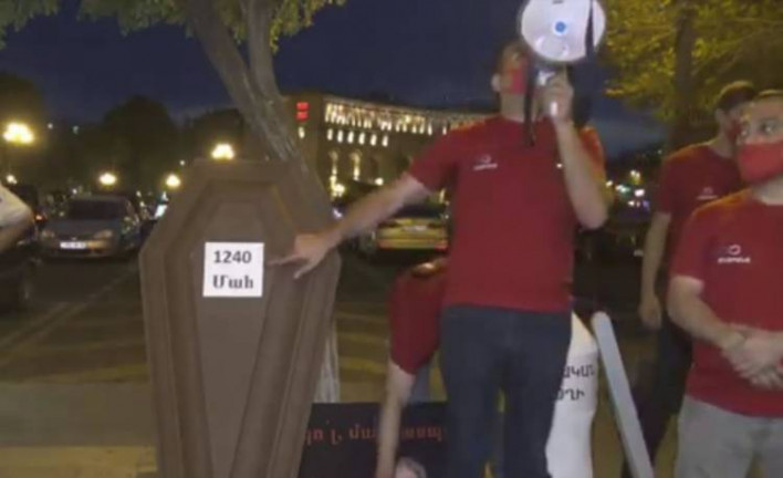 Կառավարարության շենքի մոտ «Այլընտրանք» ՀԿ-ի անդամները արտասովոր ակցիա են իրականացրել, տեղադրել են դագաղ, տնական օղու մեծ շիշ, պինցետ և պաստառ «Նիկոլ, մարդասպան» գրությամբ: Ակցիայի նախաձեռնության հեղինակները այսպիսով ցանկանում են ցույց տալ իշխանության ապիկարությունը կորոնավիրուսի դեմ պայքարում, իսկ պինցետն ու օղու շշի առկայությամբ խորհրդանշում վարչապետի հայտարարությունը, թե կորոնավիրուսն ում շունն է, պինցետով կքաշենք, տնական ողիով կսպանենք: