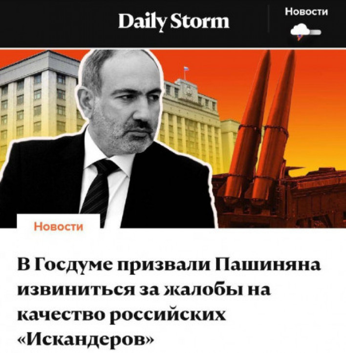 ՌԴ Պետդումայի պաշտպանության կոմիտեի նախագահի առաջին տեղակալ Ալեքսանդր Շերինը Daily Storm-ին տված հարցազրույցում կարծիք է հայտնել, թե Փաշինյանը, քննադատելով ռուսական Իսկանդերը, ցանկանում է ընդգծել իր անմեղությունը պարտության մեջ։