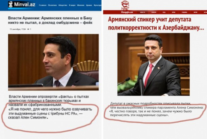 Ադրբեջանական մամուլը վերջին օրերին հեղեղված է Ալեն Սիմոնյանից մեջբերումներով։ Նա դարձել է ադրբեջանցիների սիրելին, քանզի հայ գերիների մասով Ալիևի վարչախմբի գազանություններն ու հանցագործությունները նա համարում է «հորինված տեսարաններ»։