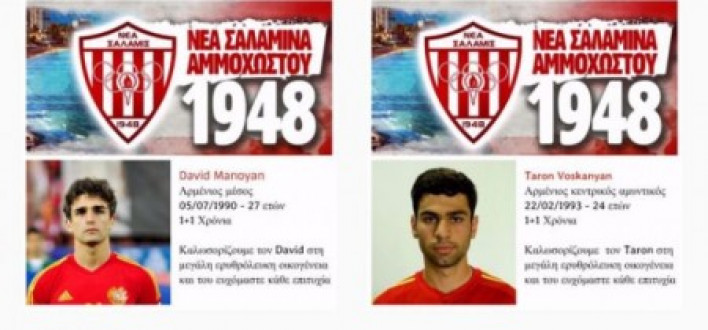 Տեղի է ունեցել ֆուտբոլի Հայաստանի հավաքականի խաղացողներ Դավիթ Մանոյանի և Տարոն Ոսկանյանի շնորհանդեսը Կիպրոսի «ՆԵԱ Սալամիս» ակումբում: Այս մասին հայտնում է «Bucket Group»-ի ֆեյսբուքյան էջը: