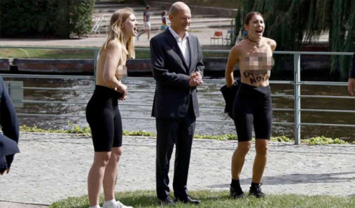 Երկու աղջիկ, Գերմանիայի կանցլեր Օլաֆ Շոլցի հետ ֆոտոսեսիայի ժամանակ, մերկացրել են կուրծքը բաց դռների օրվա շրջանակներում, փոխանցում է ՌԻԱ Նովոստին։