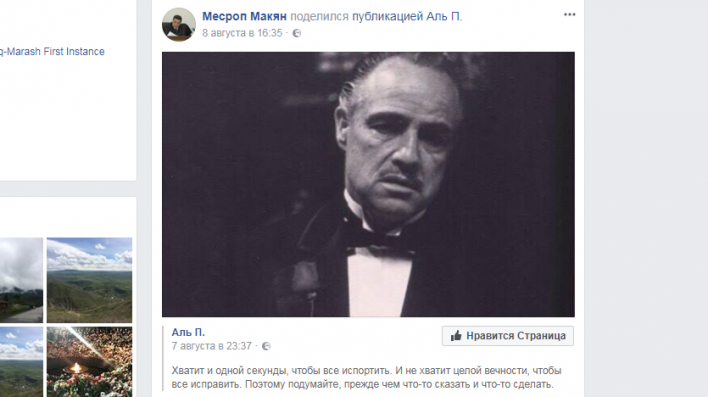 Հրապարակը գրում է. Երեւանի Կենտրոն եւ Նորք-Մարաշ վարչական շրջանների ընդհանուր իրավասության դատարանի դատավոր Մեսրոպ Մակյանի կուռքը հանցագործ աշխարհի պարագլուխն է, տվյալ դեպքում՝ սիցիլական մաֆիայի կնքահայր Դոն Կոռլեոնեն։ Դատավորն իր ՖԲ էջում տեղադրել է Դոն Կոռլեոնեի հայտնի խոսքերից մեկն այն մասին, որ ինչ-որ բան անելուց կամ ասելուց առաջ մտածեք, քանի որ մեկ վայրկյանը բավական է ամեն ինչ փչացնելու համար, սակայն մի հավերժությունը բավական չէ ուղղելու համար։ Մնում է հուսալ, որ ամուսնու համակրանքը դեպի հանցագործ տարրերը չեն համակել նաեւ կնոջը՝ ԿԳՆ պաշտոնյա Սյուզան Մակյանին՝ մատաղ սերնդին կրթելու մասով։