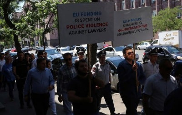 «Փաստ» օրաթերթը գրում է. «Օրերս տեղի ունեցավ ՀՀ-ում գործունեություն ծավալող մի քանի տասնյակ փաստաբանների բողոքի երթը, որը կապված էր փաստաբանների նկատմամբ արդեն որերորդ անգամ կիրառվող բռնությունների, ի մասնավորի՝ ոստիկանության բաժնում հունիսի 7-ին փաստաբան Կարեն Ալավերդյանին ոստիկանության մի խումբ ծառայողների կողմից ծեծի ենթարկելու, նրա նկատմամբ ձեռնաշղթաներ ու արցունքաբեր գազ կիրառելու հանգամանքով (ի դեպ, այս ամենից հետո Ալավերդյանը ձերբակալվել է և խուզարկության ենթարկվել)։ Փաստաբանները պալատի վարչական շենքից շարժվել և իրենց բողոքի ձայնն են բարձրացրել Հայաստանում ԵՄ պատվիրակության գրասենյակի դիմաց:
