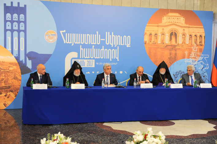 Նախագահ Սերժ Սարգսյանն այսօր Հայաստան-սփյուռք 6-րդ համաժողովի շրջանակներում մասնակցել է տարբեր ուղղություններով թեմատիկ քննարկումներից մեկին՝ Համահայկական խորհրդի ստեղծման և Հայաստան-սփյուռք գործակցության հետագա զարգացման հարցերին նվիրված աշխատանքային խմբի խորհրդակցությանը: Հանրապետության Նախագահը հանդես է եկել ելույթով: *** Նախագահ Սերժ Սարգսյանի ելույթը Հայաստան-սփյուռք համաժողովի աշխատանքային խմբի խորհրդակցությանը Հարգելի՛ գործընկերներ, Սիրով կրկին ողջունում եմ ձեզ: Այժմ հանդիպել ենք արդեն մի շատ հստակ հարցադրում քննարկելու համար: Այն է՝ Համահայկական խորհրդի ստեղծումը և այդ համատեքստում ընդհանուր առմամբ Հայաստան-սփյուռք գործակցության ապագան: Ազգային միասնությունը, իհարկե, շատ կարևոր նպատակադրում է, որը մշտապես գտնվում է յուրաքանչյուր ժողովրդի օրակարգում: Անվիճելի է, որ ընդհանուր ուժերի կենտրոնացումը և այդպիսով եղած ռեսուրսների ճիշտ բաշխումն անհրաժեշտ է ամեն մի ժողովրդի առջև ծառացած մարտահրավերներին արդյունավետ արձագանքելու համար: Սա հատկապես կարևոր հարցադրում է այն ժողովուրդների համար, որոնք սփռված են աշխարհով մեկ: Հայերի պարագայում դրա պատճառը եղել է մեր դեմ իրականացված ցեղասպանությունը և բռնաճնշումները: Սփյուռքում ծնվելը, ապրելը և գործելը չի եղել այստեղ ներկա գտնվող մարդկանց նախնիների ազատ ընտրությունը: Այն եղել է նրանց հանդեպ իրագործված պարտադրանքի, բռնության, հայրենազրկման ոճրի արդյունք: Այդ պայմաններում հայերիս համար համազգային միասնության և արդյունավետ համագործակցության կազմակերպման ձևի հարցը մշտապես եղել է օրակարգում: Այն հատկապես սուր է եղել անկախ պետականության բացակայության և ազգային-պետական ինստիտուտների լիարժեք կայացած չլինելու պատճառով: Գաղտնիք չէ, որ Խորհրդային Հայաստանում և սփյուռքում ապրող հայ մտավորականների համար դա մշտապես եղել է ամենակարևոր հարցերից մեկը: Սակայն նաև պարզ է, որ աշխարհում տիրող սուր գաղափարական բաժանումը բացարձակապես չէր կարող նպաստել այդ տեսլականի իրագործմանը: Այսօր՝ Հայաստանի անկախության պայմաններում, մենք արդեն ունենք կայացած պետականություն՝ ավելի բարենպաստ վիճակում ենք այս և նման խնդիրներին անդրադառնալու համար: Հարգելի՛ գործընկերներ, Համահայկական միասնության և կազմակերպական ձևի հարցի քննարկման, դրա լուծումների փնտրտուքի շատ հարուստ և բազմաբնույթ փորձ ենք կուտակել, որին, կարծում եմ, այստեղ անդրադառնալու կարիքը չկա: Սակայն անցած ճանապարհից, անշուշտ, կարելի է կատարել մի շարք եզրակացություններ: Առաջին եզրակացությունը, իմ կարծիքով, այն է, որ յուրաքանչյուր ժողովրդի ամենակարևոր և ամենակենսունակ ինքնակազմակերպման ձևը ժամանակակից ազգային պետությունն է: Հայաստանն այսօր այդպիսին է՝ դրան բնորոշ բոլոր անհրաժեշտ ինստիտուտներով, որոնք, ի թիվս այլ կարևոր գործառույթների՝ այսօր հավուր պատշաճի պաշտպանում են մարդու իրավունքներն ու ազատությունները, ազգային-պետական շահերը և անվտանգությունը: Այո՛, Հայաստանի պետությունը թերևս կատարյալ չէ, բայց կան բոլոր հիմքերն այն ամրապնդելու, բարեփոխելու և ավելի լավը դարձնելու համար: Ուստի, ինչ կառույց էլ ստեղծենք, այն գալու է փոխլրացնելու, զորավիգ լինելու Հայաստանի պետականությանը: Հայոց ցեղասպանության 100-րդ տարելիցի միջոցառումները վկայեցին, որ մեր պետությունը պատրաստ է և կարող է ստանձնել առաջնորդողի դերը: Ավելին, այդ առաջնորդությունը սպասված էր նաև սփյուռքում: Երկրորդը. ինչ կառույց էլ ստեղծենք, այն կոչված չի՛ լինելու փոխարինելու կամ մրցակցելու սփյուռքում արդեն գոյություն ունեցող կազմակերպական կառույցներին: Այս գործընթացի նպատակ