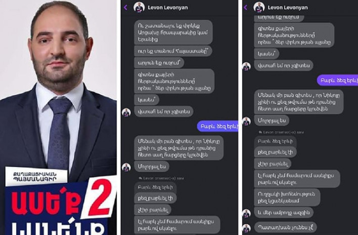 Գառնիկ Դավթյանը տելեգրամյան իր ալիքում տարածել է ՔՊ-ի Վերահսկող հանձնաժողովի անդամի Լևոն Լևոնյանի այս սքրինշոթերը՝ գրելով. «Ուրեմն էս ՔՊ-ի Վերահսկող հանձնաժողովի անդամի Լևոն Լևոնյանը հոգեբնական ճնշում է գործադրում քաղաքացու վրա, ով որոշել է միանալ նիկոլին վռնդելու քաղաքական, հասարական և ժողովրդական պայքարին: