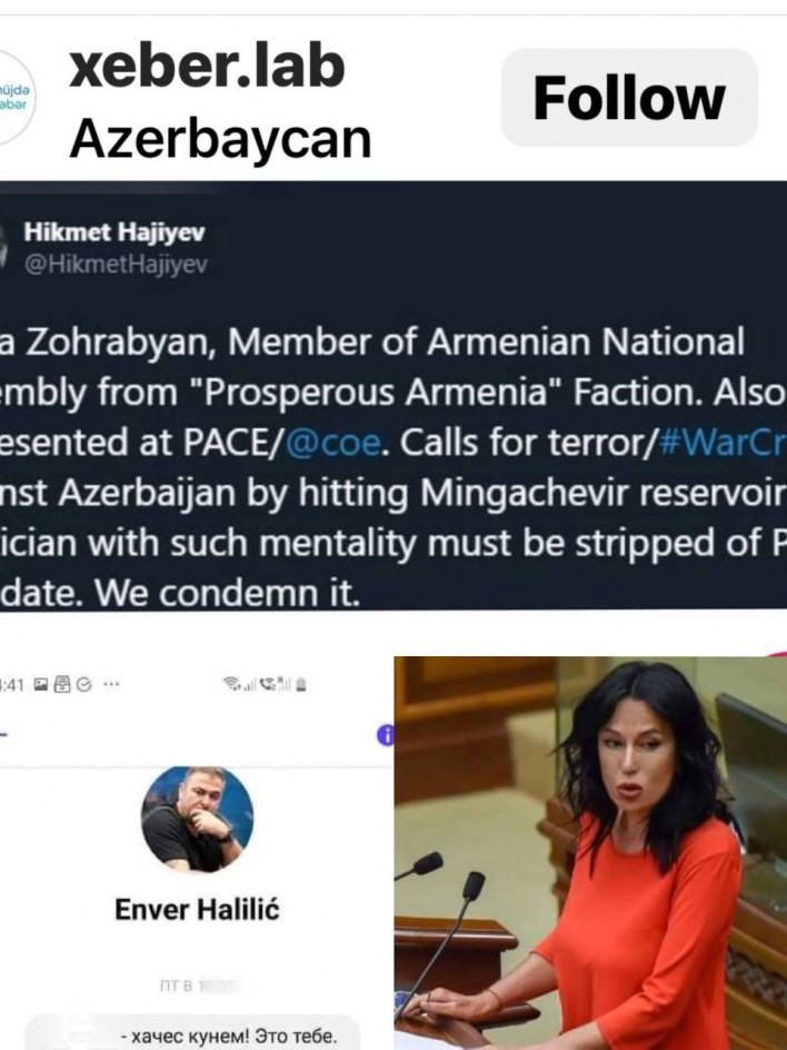 Քաղաքական գործիչ Նաիրա Զոհրաբյանը, ով նախօրեին եթերում սպառնացել էր կտրել Ալիեւի օգնական Հիքմեթ Հաջիեւի ականջը, հայտնվել է ադրբեջանական գրոհի տակ եւ ադրբեջանցիները նրա հեռախոսահամարին են ուղարկում մեր զինվորների եւ քաղաքացիական անձանց հանդեպ իրենց զինուժի կատարած ոճրագործությունների տեսանյութերն ու սպառնում, որ հաջորդն իր գլուխն են կտրելու։