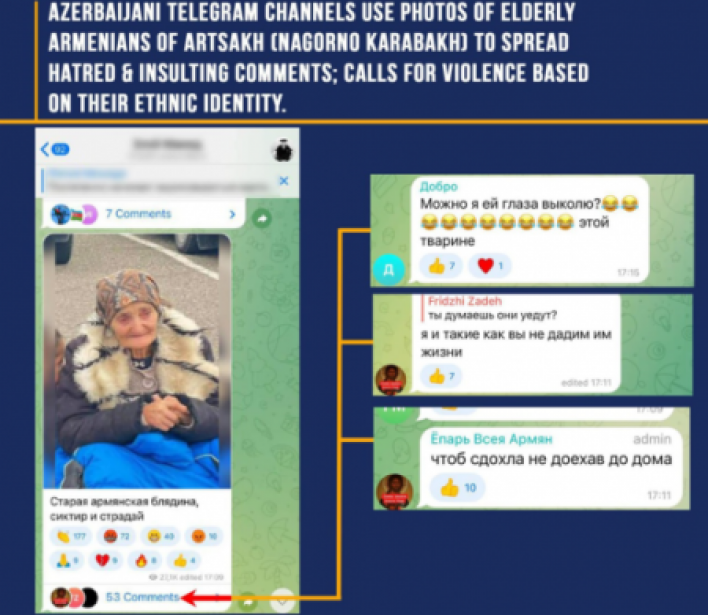 Ադրբեջանական սոցիալական մեդիայում մեկնաբանությունները պարունակում են սպանության, բռնության կոչեր և արժանապատվությունը նսեմացնող բովանդակություն, ծաղրում են հայ կանանց (որպես մայրեր, դուստրեր)` միայն հայկական էթնիկ պատկանելիության հիմքով: