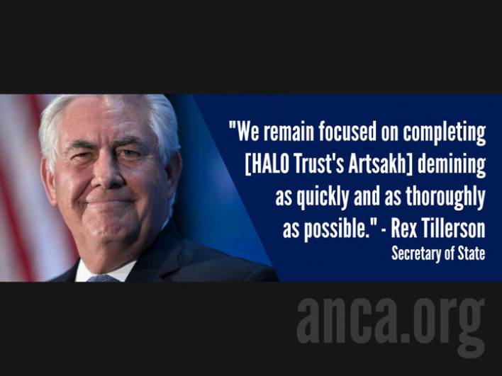 Ամերիկայի հայկական ազգային կոմիտեն ողջունել է պետքարտուղար Ռեքս Թիլերսոնի հայտարարությունը, որը ԱՄՆ-ն աջակցում է Արցախի ականազերծման աշխատանքները հնարավորինս շուտ ավարտին հասցնելու ջանքերին: Այս մասին նշված է կոմիտեի կայքում:Թիլերոնը վերահաստատել է Պետդեպարտամնենտի աջակցությունն Արցախում խաղաղության առաջարկներին, որոնք ներկայացրել են Ներկայացուցիչների պալատի արտաքին հարաբերությունների հանձնաժողովի նախագահ Էդ Ռոյսը և դեմոկրատ Էլիոթ Էնգելը:«Մենք ողջունում ենք Արցախում ԱՄՆ կողմից ֆինանսավորվող HALO Trust մարդասիրական ականազերծմանը պետքարտուղար Թիլերսոնի աջակցությունը», - ասել է Ամերիկայի հայկական ազգային կոմիտեի ղեկավար Արամ Համբարյանը: