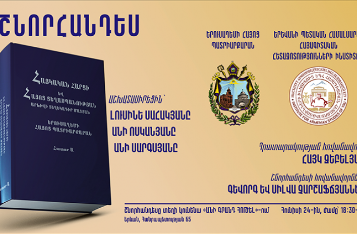 2024 թ. հուլիսի 24-ին ժամը 18։30-ին «Անի Գրանթ հյուրանոցի» սրահում տեղի կունենա «Հայկական հարցի և Հայոց ցեղասպանության արխիվի տեղեկագիր մատյան. Երուսաղեմի Հայոց պատրիարքարան» (հատոր Ա.,Երևան, «Լուսակն», 1040 էջ) մեծադիր գրքի՝ աշխատասիրությամբ Լուսինե Սահակյանի, Անի Ոսկանյանի և Անի Սարգսյանի երևանյան շնորհանդեսը։ Սույն ուսումնասիրությունը կատարվել է՝ համագործակցաբար Երուսաղեմի Հայոց պատրիարքության և Երևանի պետական համալսարանի Հայագիտական հետազոտությունների ինստուտուտի և Գիտության կոմիտեի ֆինանսավորմամբ։ Գրքի խմբագրականկազմը՝ Վահրամ Շեմմասյան (ԱՄՆ), Վաչե Բրուտյան (ԱՄՆ), Ռուբեն Մելքոնյան, Միհրան Մինասյան, Ալեքսանդր Սաֆարյան, Սերգեյ Վարդանյան, Սեդա Գասպարյան, Վարուժան Պողոսյան։