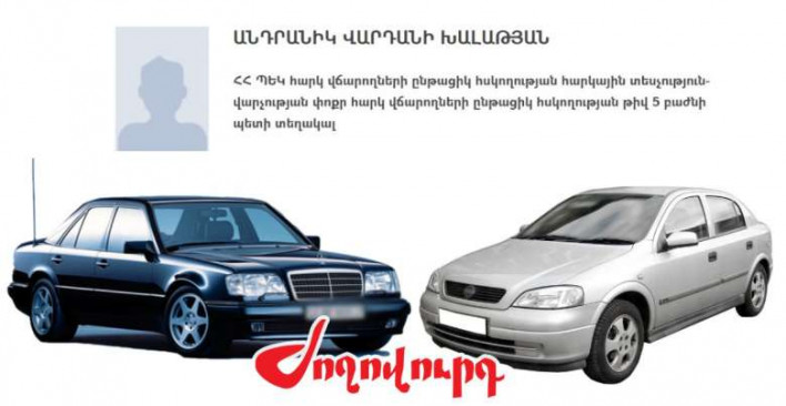 «Ժողովուրդ» օրաթերթը գրում է․ «Ներկայացվող փաստաթղթերը ՊԵԿ Նոր Նորքի հարկային տեսչության պետ Անդրանիկ Խալաթյանի հայտարարագրից են։ Ըստ փաստաթղթերի՝ Խալաթյանը 2021 թվականին գնել է «Մերսեդես» և «Օպել» մակնիշի մեքենաներ, ապա 2023 թվականին դրանք նվիրել է այլ անձանց։