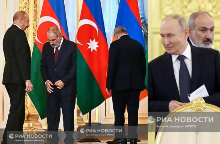 Տարածվող երկու լուսանկարներից մեկում, որոնք ֆիքսել է գործակալության լուսանկարիչ Կրիստինա Կորմիլիցինան, որը ՌԴ նախագահի լուսանկարիչներից է, Նիկոլ Փաշինյանը լուսանկարվել է այնպիսի տեսանկյունից ասես խոնարհված է Ադրբեջանի դրոշի առջև, իսկ մյուս լուսանկարում Ալիևի հայացքի ներքո Փաշինյանը կրկին ադրբեջանական դրոշի առջև ուղղում է տաբատը: