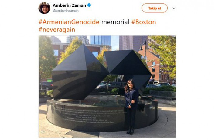 Թուրք լրագրող Ամբերին Զամանը ԱՄՆ-ում Հայոց ցեղասպանության հուշակոթողի մոտ արված լուսանկար է հրապարակել: Հայտնի լրագրողը Twitter-ում կատարած հրապարակմանը կից օգտագործել է «Հայոց ցեղասպանության հոշակոթող», «Բոստոն», «այլևս երբեք» (#ArmenianGenocide memorial, #Boston, #neveragain ) հեշթագերը: Նշենք, որ Զամանը Հայոց ցեղասպանության 100-րդ տարելիցին նվիրված «100 վայրկյան» նախագծի մասնակիցներից է և նախագծի համար կարդացել է Ցեղասպանությունը վերապրած Սառա Մուրադյանի վկայությունը: Ermenihaber.am-ի փոխանցմամբ՝ լրագրողի հրապարակումը թուրքական մամուլում բուռն դժգոհություն է առաջացրել, իսկ թեմային անդրադարձած «Ensonhaber.com» լրատվակայքը շտապել է Զամանին մեղադրել «ահաբեկչական կառույցների խոսնակ» լինելու և հակաթուրքական գործունեություն իրականացնելու մեջ: