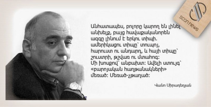 Այսօր Վանո Սիրադեղյանի ծննդյան օրն է «Հայրենիքի, անշուշտ, մեծն է լավը։ Ինչպես և վարունգի՝ կանաչը։ Աղջկա՝ կույսը։ Կրծքի՝ երկու հատը։ Ազգի՝ համաշխարհայինը։ ՀՀՇ֊-ի՝ նախկինը։ Ռամկավարի՝ դաշնակը։ Դաշնակի՝ հիմարը։ Դեպուտատի՝ օգտագործածը։ Ռետինի՝ կոմպլեմենտարը՝ վերջում գլխին քաշելու համար։ Իսկ խոսնակի՝ խոշորը։ Փոխխոսնակի՝ խուրդեն։ Վարչապետի՝ հաստը։ Արտգործնախարարի՝ ծալովին։ Ընդդիմադրի՝ փսլնքոտը։ Սոցիալիստի՝ Աշոտը։ Կոմունիստի՝ պահանջատերը։ Խմբագրի՝ քարթուն։ Պուտանկի՝ մատղաշը։ Խաշի՝ թափանցիկը։ Իկեբանայի՝ ժինգալով հացը։ Վարկի՝ կորածը։ Ազգին չկպչենք։ Որովհետև ազգը չի կարող լինել ախմախ։ Անհատապես, բոլորը կարող են լինել անխելք, բայց հավաքականորեն ազգը լինում է երկու տիպի. ամերիկացու տիպը՝ տուպոյ, հարուստ ու անդարդ, և հայի տիպը՝ շուստրի, թշվառ ու մտահոգ։ Մի խոսքով՝ անբախտ։ Ավելի ստույգ՝ «բարոյական հաղթանակների» մեռած։ Մեռած-չթաղած։ Եվ այլն։ Ո՞վ չէր ուզենա, որ իր երկրի բյուջեն լինի Ամերիկայի բյուջեի չափ, բանակը՝ չինականի, Փոքր Մասիսը՝ Մեծից բարձր (կամ՝ մեկը մյուսից ավելի բարձր), տուն պահողի աշխատավարձը՝ 40 հազար, իսկ Հայրենիքը՝ մի քանի հատ ու բոլորը՝ պատմական։ Նաև՝ ծովերից ծով։ Ընդհանրապես ասած, սովորական, սիքտիրչի ազգերը ընդամենը մեկ հայրենիք են ունենում, բայց արի ու տես, որ այն ոչ միայն սիրում են, որի մասին ոչ միայն երգեր են երգում, այլև դեպքից դեպք պաշտպանում էլ են։ Նաև (որքան էլ տարօրինակ թվա) այնտեղ ապրում են։ Անկախ այն բանից՝ մեծ է, թե փոքր։ Հաստ է, թե բարակ։ Երկար է, թե կարճ։ Քարից հաց քամելու մազոխիստական հաճույքի հնարավորություն պարգևո՞ւմ է, թե՞ ոչ։ Պատմական թշնամի ունենալու բերկրանք պատճառո՞ւմ է, թե՞ չի պատճառում։ Եվ պատկերացրեք, առանց այդ «ազգային առանձնահատկությունների» անհրաժեշտության գիտակցության ապրում են անդարդ՝ իրենց մեծ ու փոքր տափա՜կ, կանաչ հարթավայրերում և դեգրադացվում՝ Ցեղասպանության ու Պահանջատիրության նման հոգին վեհացնող բաների բացակայության պատճառով։ Ճիշտ է, ամենքն էլ հոգու խորքում ուզում են մեկից ավելի Հայրենիք։ Նրանք էլ են հոգու խորքում ուզում մի քիչ ավելի լեն դաշտ, մի քիչ ավելի խոր գետ։ Բայց որովհետև բոլոր ժողովուրդներն են ուզում (բնականաբար, մեկը մյուսի հաշվին) և բոլորն են ուզում, ամենքը ստիպված յոլա են գնում եղածով, կինը՝ աստծո տված ամուսնու ներուժով, ամուսինը՝ իր կնոջ նաղդով։ Ձախ ու աջ շեղումներն էլ լինում են անհատական թուլությունների շրջանակներում, ոչ թե մերի նման ազգային-համազգային-մղձավանջային։ Համենայնդեպս, հրապարակային քննարկման առարկա չեն դարձնում մեծն ու փոքրը, հաստն ու բարակը, կանաչն ու ճլորածը։ Համենայնդեպս, ուստեն ի նշան բողոքի, ընդդեմ պատմական, մարդակազմական անարդարության, պատին զարկելով չի ջարդում իր չագուճը, ինչ է թե՝ ուրիշինի կոթը բռնելու ավելի հարմար է։ Ի դեպ, եթե բանը անարդարության հասավ, կարելի է նեղանալ սեփական հորից վերջին հաշվով։ Բայց չէ։ Խռովելը խռովել է, պետք է խռովել մասշտաբայնորեն։ Աշխարհացունց ընդվզումով։ Մինչև ինքնամզում։ Մինչև ինքնամսխում։ Մինչև քոքը։ Մահ կամ ազատություն։ Հառա՜ջ ի մահ։ Ով հետ՝ քամակը փետ։ Եվ այլն։ Լոռեցիք անհիմն շատն ու մեծը ուզողի, ուզվորի համար ազդեցիկ մի խոսք ունեն, թե՝ շատը գոմշի թրիքն է, իսկ մեծը՝ էշի։ Հասկացանք։ Խոսքը մեր մեջ, եթե հայրենիքում չես ապրում, ի՞նչ տարբերություն՝ դա մե՞ծ է, թե՞ փոքր։ Հա՞ստ է, թե՞ բարակ։ Պատմակա՞ն է, թե՞ ներկա։ Փոսո՞ւմ է, թե՞… Բայց սա մահկանացու հայաստանցու միտք է, այլ ոչ կենցաղային ու քաղաքական գողուբոզի, որի համար մեծը նշանակում է կուշտ ու անպատասխանատու։ Մի տեղ ապրում ես, մյուս տեղը գողանում ես, երրորդ տեղը թռցրածը թաքցն