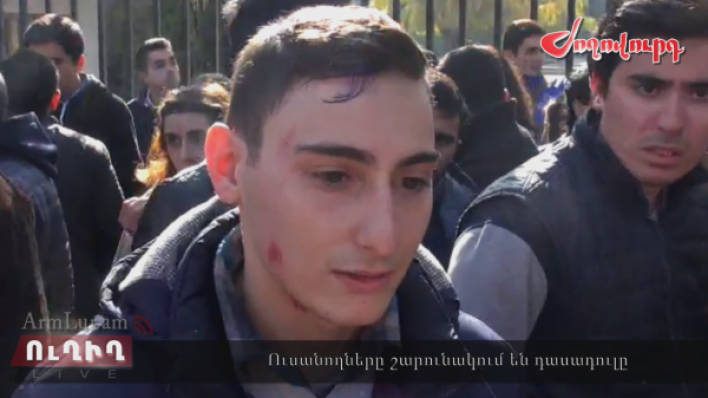 Այսօր առավոտյան դասադուլ իրականացնող ուսանողները հավաքվելով ԵՊՀ-ի մոտ երթով շարժվել են Աժ: Նախատեսված ժամից ուշ նրանք հավաքվել են Աժ-ի Դեմիրճյան փողոցին հարող մուտքի մոտ և վանկարկել«Տարկետում լինելու Ա»: Նախաձեռնող խմբի անդամները մի քանի րոպե խորհրդակցելուց հետո ուսանողներին կոչ արեցին վերադառնալ Աժ-ի գլխավոր մուտքի մոտ և այնտեղ շարունակել ակցիան: Այդ որոշման վերաբերյալ որևէ բացատրություն չհնչեց: Դեմիրճյան փողոցից մուտք գործելով Բաղրամյան պողոտա ուսանողները փակեցին երթևեկության մի գոտին: Իրավիճակը լարվել է, մեծ թվով ոստիկաններ են ժամանել, փորձում են ուսանողներին հեռացնել փողոցի երթեւեկելի մասից: Տեղում է ՀՀ ոստիկանության Երևան քաղաքի վարչության պետի տեղակալ, ոստիկանության գնդապետ Վալերի Օսիպյանը: Վերջինս ուսանողներին 5 րոպե ժամանակ տվեց փողոցն ազատելու համար: Իրավիճակը լարվել է. ոստիկաններն անցել են ուժի գործադրման: Նրանք փորձում են ցուցարար ուսանողներին ուժով հեռացնել տեղանքից: Արդյունքում մասնակիցները մեկը ընկել է գետնին և վնասվածքներ ստացել: Երեւանի փոխոստիկանապետ Վալերի Օսիպյանը լրագրողների հետ զրույցում ասաց, որ ոստիկանության գործողությունները ուժ կիրառելու հարցում, համաչափ են եղել: Դիտարկմանը, որ կան վնասվածք ստացած ուսանողներ, Վալերի Օսիպյանն ասաց, որ կարող են դիմել իրենց եւ ըստ վերադասության սկզբունքի դեպքին ընթացք կտրվի: