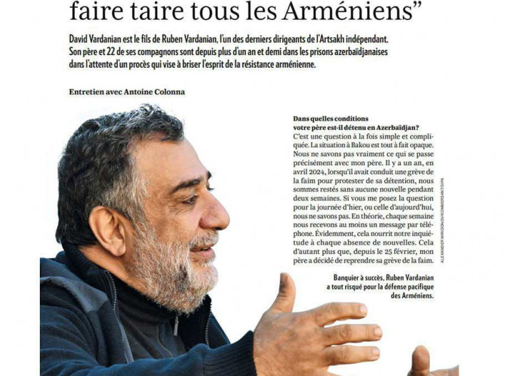 Сын незаконно удерживаемого в Баку Рубена Варданяна Давид Варданян дал интервью французскому изданию LE SPECTACLE DU MONDE. Варданян-младший рассказал об исторической возможности правительства Армении, которое может изменить отношение Госдепа США как к армянскому народу, так и к вопросу возвращения Армянских пленных из Азербайджана. Варданян в интервью французскому изданию также отметил, что Баку использует образ и авторитет его отца, чтобы направить месседж в логике запугивания и унижения армян. Ниже приведены несколько ответов на вопросы, заданные Варданяну.