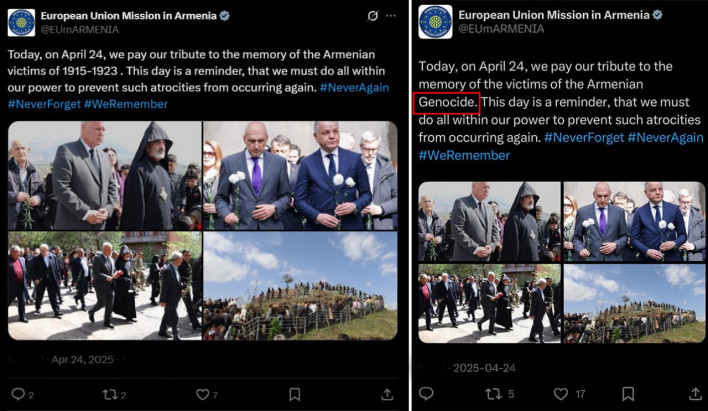 Հայաստանում ԵՄ–ի դիտորդական առաքելությունն X-ի իր էջից հեռացրել է Հայոց Ցեղասպանության 110-րդ տարելիցի վերաբերյալ այն գրառումը, որը «Ցեղասպանություն» բառն էր պարունակում, հետո տեղադրել է նոր գրառում, որտեղ բացակայում է «Ցեղասպանությունը», իսկ փոխարենը նշվում է, որ առաքելությունը հարգանքի տուրք է մատուցել 1915-23 թվականների հայ զոհերի հիշատակին։