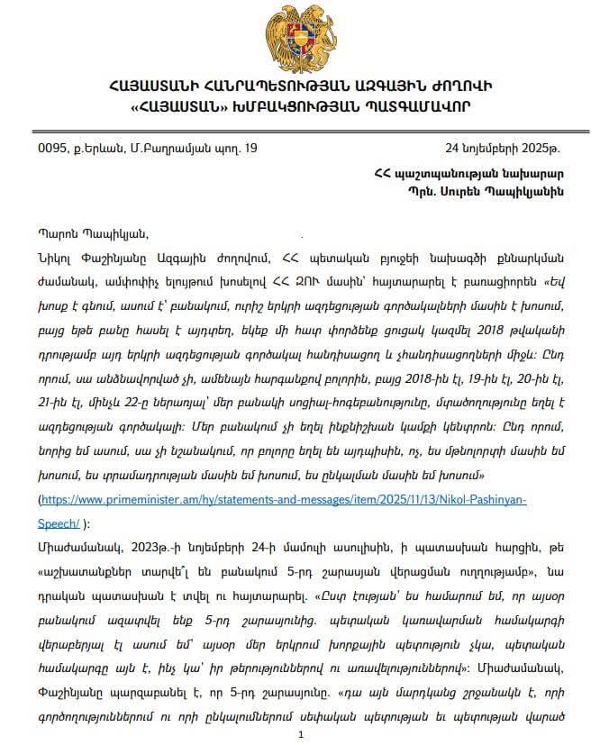 ԱԺ պատգամավոր Գեղամ Մանուկյանը գրում է. «ՊԱՇՏՊԱՆՈՒԹՅԱՆ ՆԱԽԱՐԱՐՈՒԹՅԱՆ ՊԱՐՏԻԶԱՆԱԿԱՆ ԼՌՈՒԹՅՈՒՆԸ