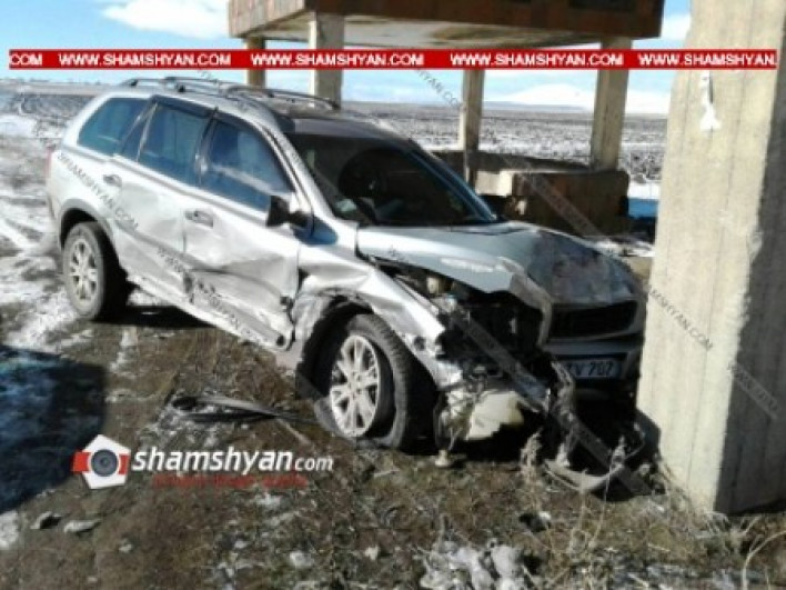 Խոշոր ավտովթար՝ Արագածոտնի մարզում. բախվել են ВАЗ 21099-ն ու Volvo-ն, որն էլ բախվել է կանգառի բետոնե սյանը