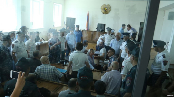 ՊՊԾ գնդում հանձնվելուց հետո Սասնա ծռերի անդամների հագուստի առգրավման գրավոր ապացույցների հրապարակման ժամանակ մեղադրողը ներկայացրեց նաև Արամ Հակոբյանի հագուստի առգրավման արձանագրությունը, ըստ որի՝ նրա տաբատը պատռված է եղել։ Արամ Հակոբյանը դատարանում հայտարարեց, որ գետնին գցած քարշ են տվել, ոչ մի փոխհրաձգություն չի եղել, պարզապես ինքը փորձել է օգնել արյունաքամ եղած անձին , հենց այդ ժամանակ էլ 6-7 հոգով հարձակվել են իր վրա և խոշտանգել։ Մարտիրոս Հակոբյանը՝ Դեդը փորձում էր պարզել, թե ինչ ապացույցներ են ներկայացվում։ Մեղադրող դատախազ Հակոբ Ենոքյանը նշեց, որ դրանք անտեղի հարցադրումներ են։ Դա առաջացրեց Մարտիրոս Հակոբյանի դժգոհությունը,ում միացան նաև Սասնա ծռերի մյուս անդամները։ Փոխադարձ մեղադրանքներից և վիրավորանքներից հետո դատավոր Արթուր Օհանյանը Մարտիրոս Հակոբյանին 3 ժամով հեռացրեց նիստերի դահլիճից և նիստն ընդմիջեց 15 րոպեով։ «Սասնա ծռեր»-ի անդամ Սերգեյ Կյուրեղյանը դատարանից պահանջեց դահլիճ վերադարձնել Մարտիրոս Հակոբյանին և պատժել մեղադրող դատախազին: Դատավորը նկատեց, որ դատախազները իրենց պարտականություններն են կատարում: «Իրենց պարտականությունը՝ ձենդ կտրի ասելն ա՞…նույն դատախազը նախորդ նիստին Մարտիրոս Հակոբյանին արձագանքեց՝ թուրքը դու ես: Դատախազը ասում ա, որ մենք անիմաստ ենք խոսում:Նա իրավունք չունի նման բան ասել: Եթե մեր ասածի իմաստը չի հասկանում, թող հարցնի՝ կպատասխանենք:Մեղադրողը մեզ վիրավորում է, իսկ Դուք դա թույլ եք տալիս»,- հունից դուրս եկավ Սերգեյ Կյուրեղյանը: Մեղադրող կողմը նշեց, որ Գլխավոր դատախազին դիմելու կարիք չկա, քանի որ իրենք կատարում են իրենց պարտականությունները: Դատավոր Արթուր Օհանյանը նախազգուշական սանկցիա կիրառեց մեղադրող կողմի նկատմամբ: Մարտիրոս Հակոբյանին դատական նիստերի դահլիճ վերադարձնելու միջնորդությունը մերժվեց: