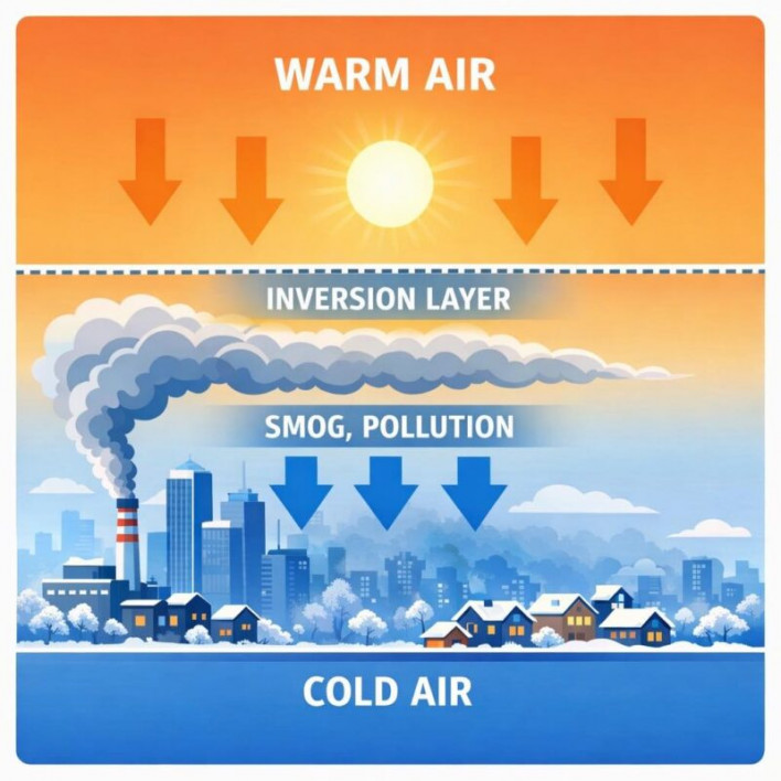 Առաջանում է մի երևույթ, որը օդերևութաբանները անվանում են ջերմաստիճանային ինվերսիա։ Պատկերացրեք շերտավոր մի տորթ, որը սխալ են հավաքել․ բարձրության հետ սառչելու փոխարեն օդը սկսում է տաքանալ։ Սառը և խիտ օդի շերտը մնում է գետնին սեղմված, իսկ դրա վերևում՝ տաք վերմակի պես, տեղավորվում է ավելի թեթև և տաք օդի շերտը։ Այս «շրջված» կառուցվածքը ամբողջովին արգելափակում է մթնոլորտի ուղղահայաց խառնուրդը՝ ստեղծելով յուրահատուկ, երբեմն էլ վտանգավոր եղանակային պայմաններ։